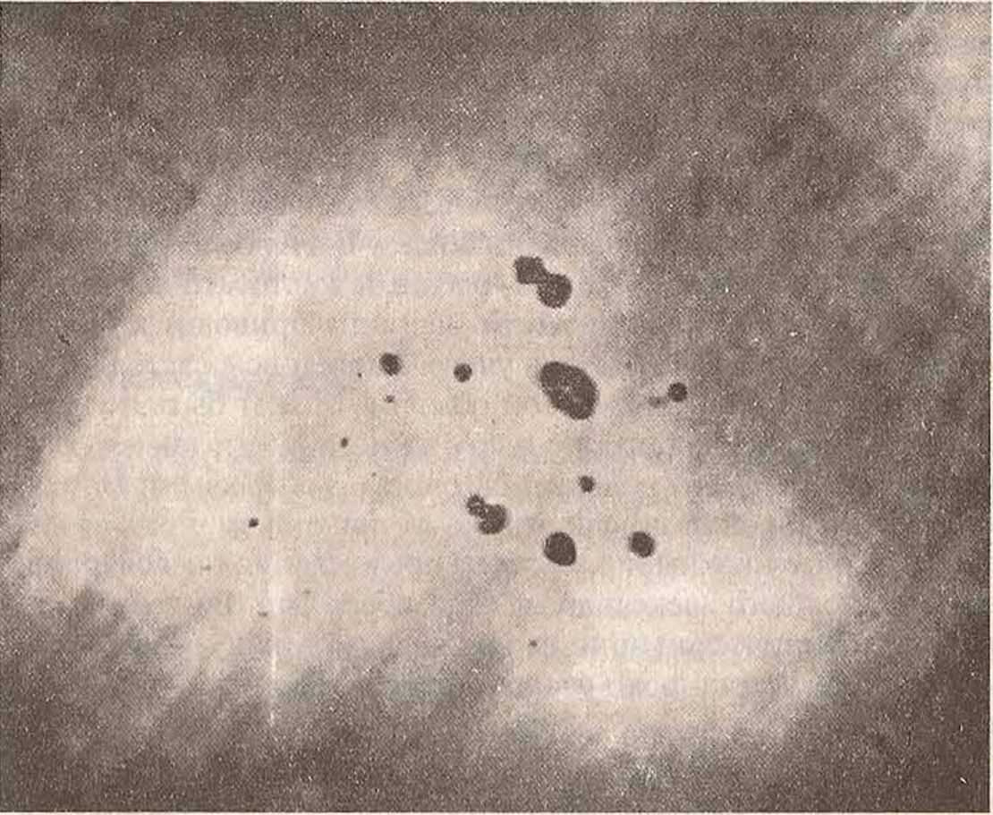 Рис. 9.13. Синтетическая шпинель между скрещенными поляроидами; видны "муар" и пузырьки. |