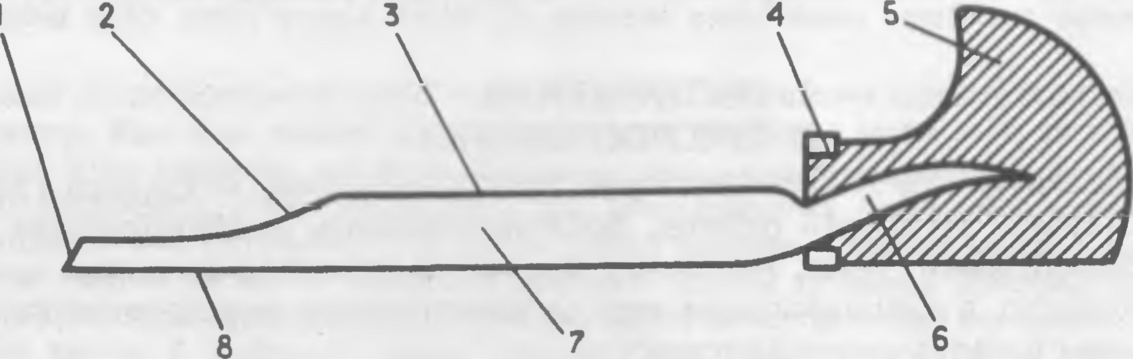 Рис. 1. Штихель:. 1 — лобовая грань; 2 — аншлиф; 3 — верхняя грань; 4 — кольцо; 5 — ручка; 6 — хвостовик (язык); 7 — боковая грань (шека); 8 — нижняя грань |